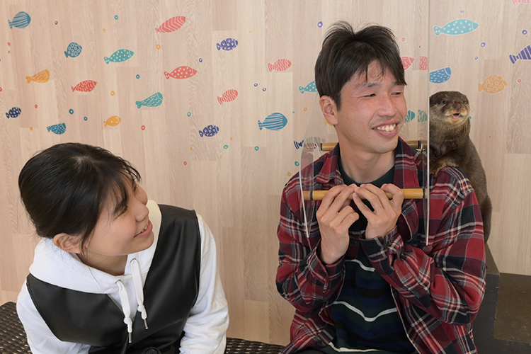 コツメカワウソがお客さまの肩に乗り、至近距離でカワウソの鳴き声、匂い、仕草などを感じながら記念撮影ができます。