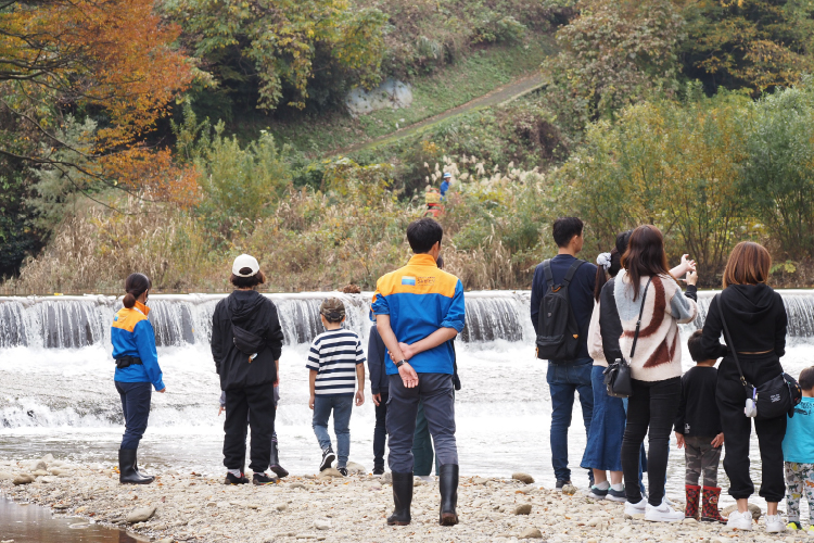 サケの遡上観察会を開催。飼育スタッフと一緒に、サケが力強く川を遡る姿を間近で観察し、サケの生態や漁業協同組合の取組や、サケの遡上と環境問題との関わりなどについて解説します。多くのサケが生まれた河川に帰ってくるよう願いを込めて、スタッフと共に周辺の清掃活動を実施しました。
