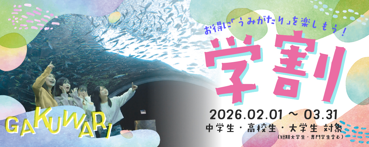 学生を対象に入館料がお得になる「学割」がスタート!当館をお得に利用できる「学割」で、大切な仲間たちとの思い出づくりを後押しします!節目の春を前に、仲間と一緒に生きものとの出会いを楽しみませんか!?