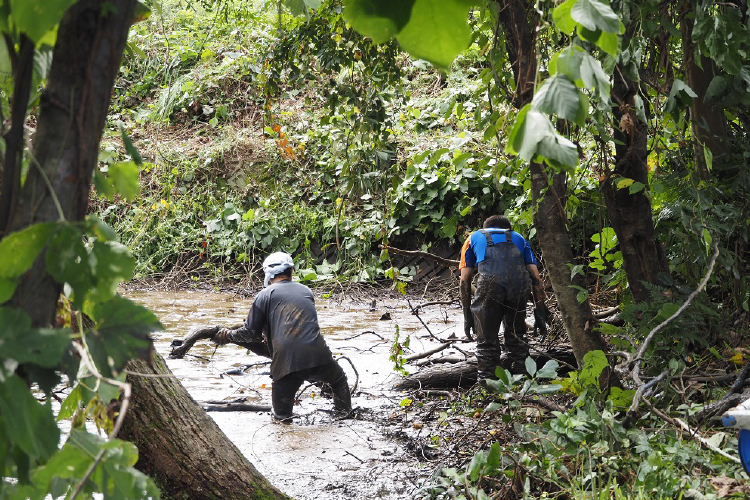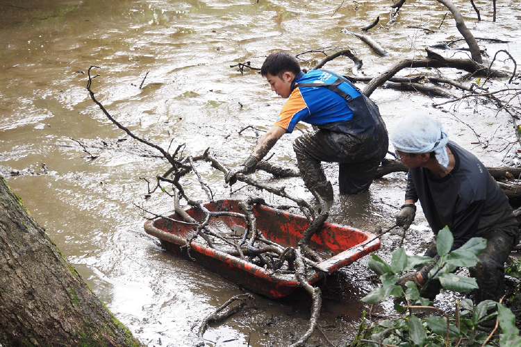 池には、倒木や枝が散乱しており、深く沈む泥の中、黙々と枝や沈殿した落ち葉の撤去に費やしました。