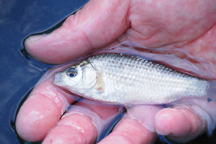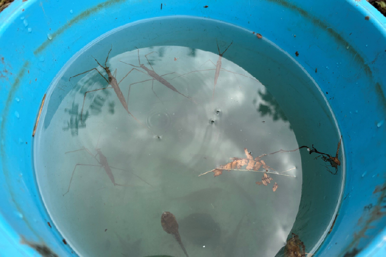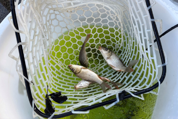 水を抜くと、コイやギンブナ、水生昆虫が確認できました。