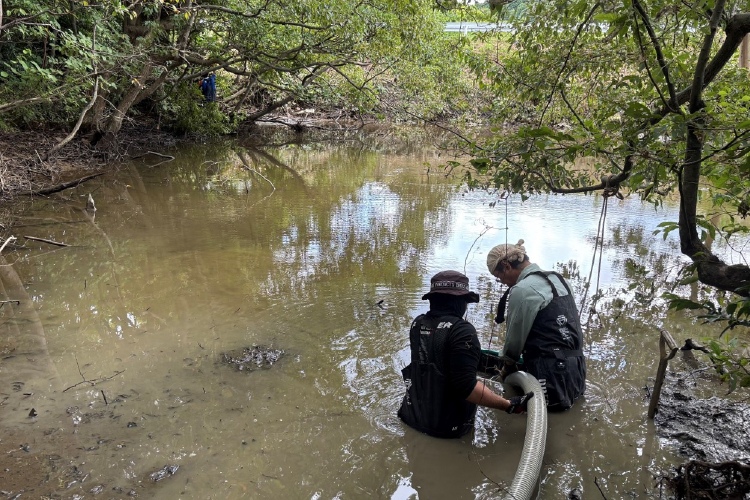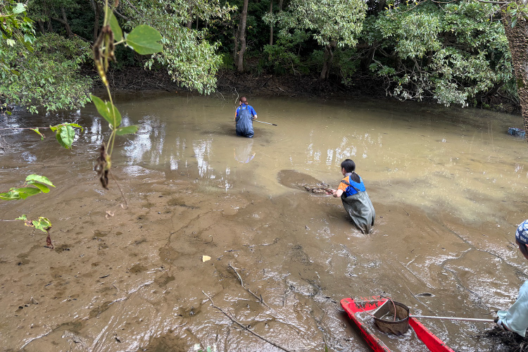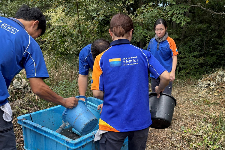 現在、キタノアカヒレタビラが生息できる環境が整った池はわずかしかないため、今回は環境の整った場所を増やせるよう移植候補地となっている池の清掃を行いました。 池の水を抜いて水底にたまったゴミやヘドロを、重機を使って取り除く大変な作業です。 私たち『うみがたり』は、水を抜いた際に採集した生きものを引き取りに行きました。胴長を着用して、水位が低くなった池へいざ入水!想像以上に沼にハマって身動きが取れないスタッフが続出する中、数名のスタッフが奮闘!コイやフナのほか、近年生息数が減ってきているミズカマキリやゲンゴロウなどがいました!