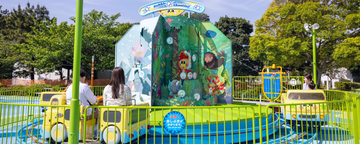 しゃぼん玉がモチーフの的に水鉄砲を打つシューティングアトラクション。