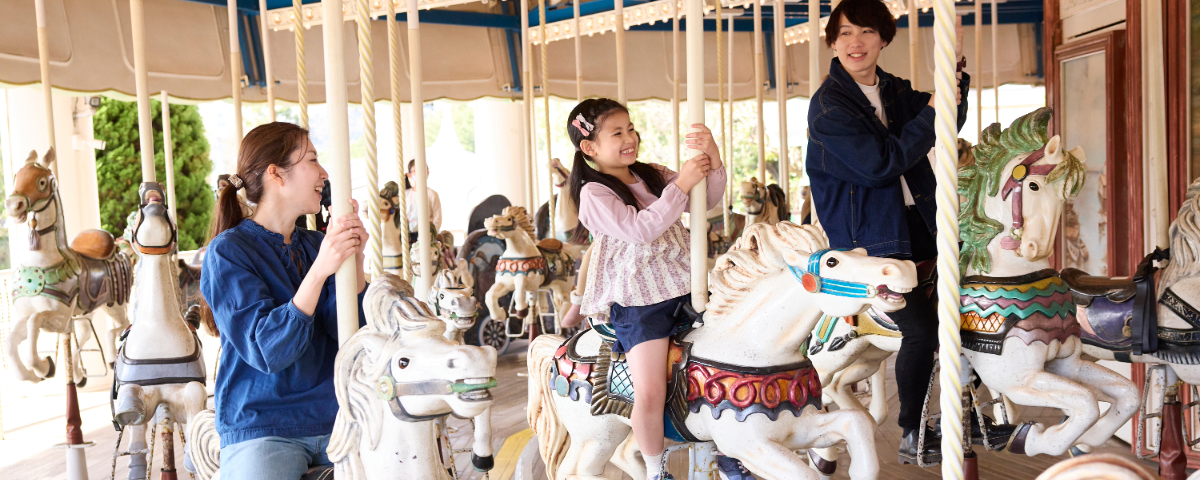 20世紀初頭の木馬専門彫刻作家たちの流れを受け継ぐ、アメリカ・サンフランシスコの木馬専門店で制作された、このメリーゴーラウンド。木馬をはじめ床も天井も全部木製だから、木の優しさやぬくもりがいっぱい。夜には4万個のイルミネーションに彩られ、まるで夢の世界へ来たみたい。