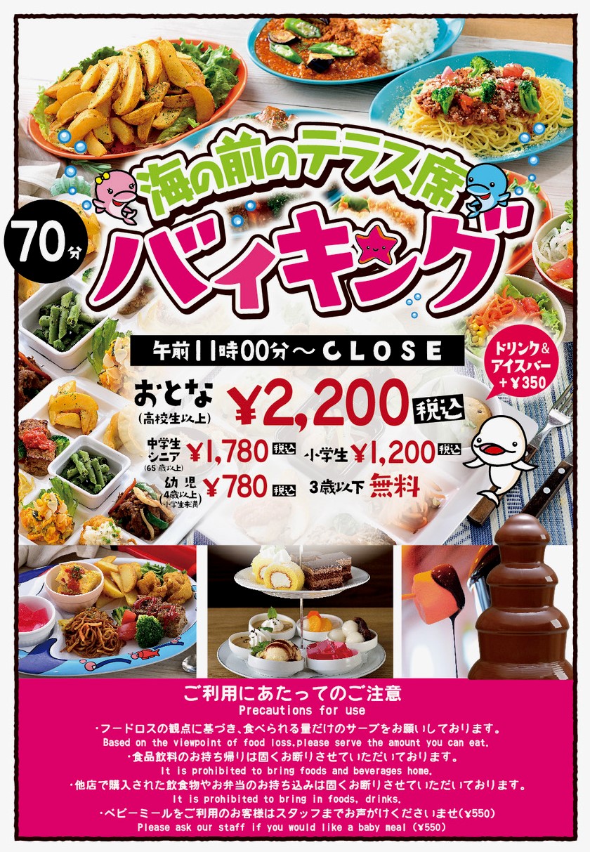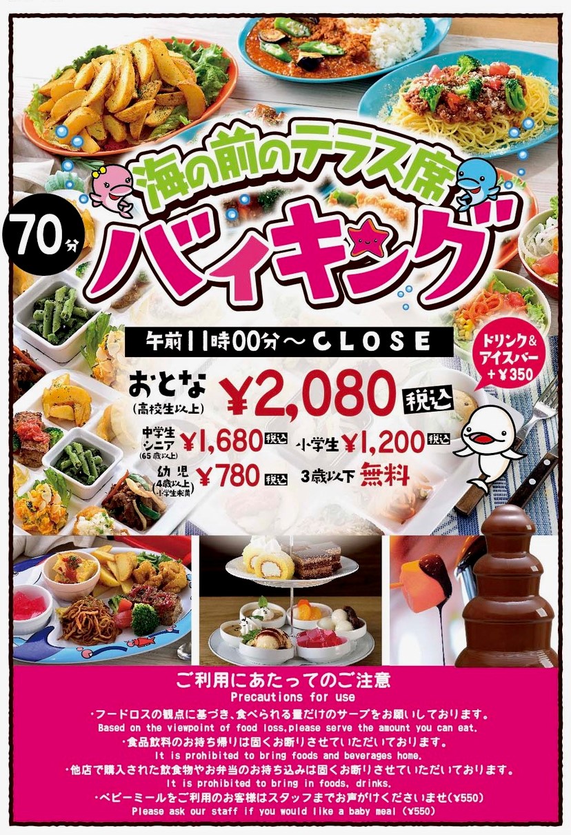 海辺の光がふんだんに満ちた明るい店内。潮風が心地よいウッディーテラスでシェフ手作りのバイキングをお楽しみください。