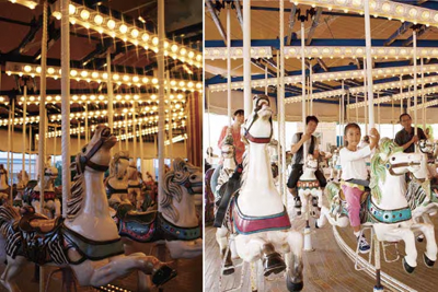 アメリカ・サンフランシスコの木馬専門店で制作された、このメリーゴーラウンド。木馬をはじめ床も天井も全部木製だから、木の優しさやぬくもりがいっぱい。夜には4万個のイルミネーションに彩られ、まるで夢の世界へ来たみたい。