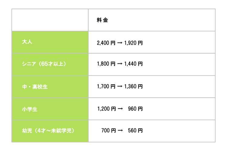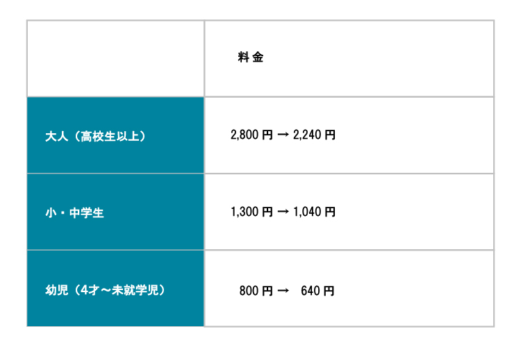 | 大人(18才以上) | 1,800円 → 1,620円 |
